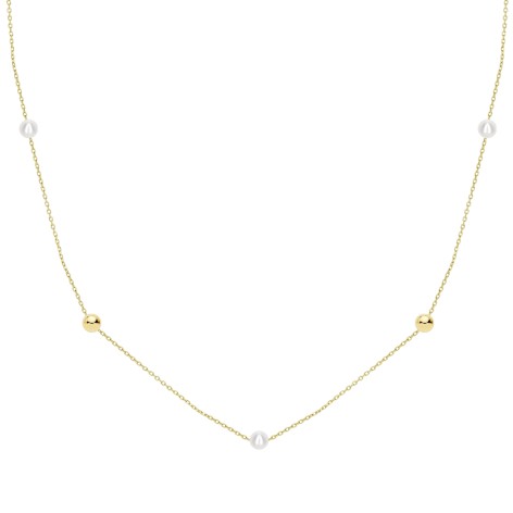 Collar de oro 18k, con cadena forzada de 45 cm y doble asa, con tres perlas (4-4.5mm) y dos bolas lisas (4mm) intercaladas a lo largo de la cadena.