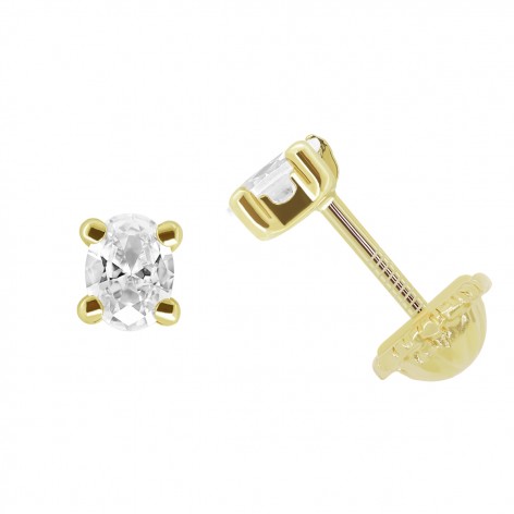 Pendientes pequeños de oro 18k y circonita oval(4x3mm) engarzada por cuatro garras con cierre de rosca.