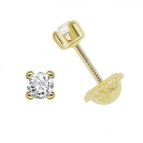 Pendientes pequeños de oro 18k y circonita (3mm) engarzada por cuatro garras con cierre de rosca.