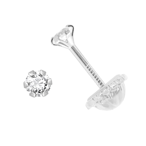 Pendientes pequeños de oro blanco 18k y circonita (2.5mm) engarzada por seis garras con cierre de rosca.