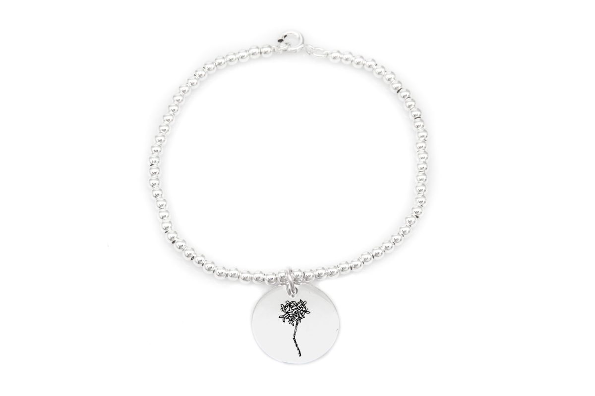 Pulsera de bolitas de 3 mm y medalla de 18mm de diámetro en plata de primera Ley 925, con una grabación hecha a mano de Biznaga malagueña.